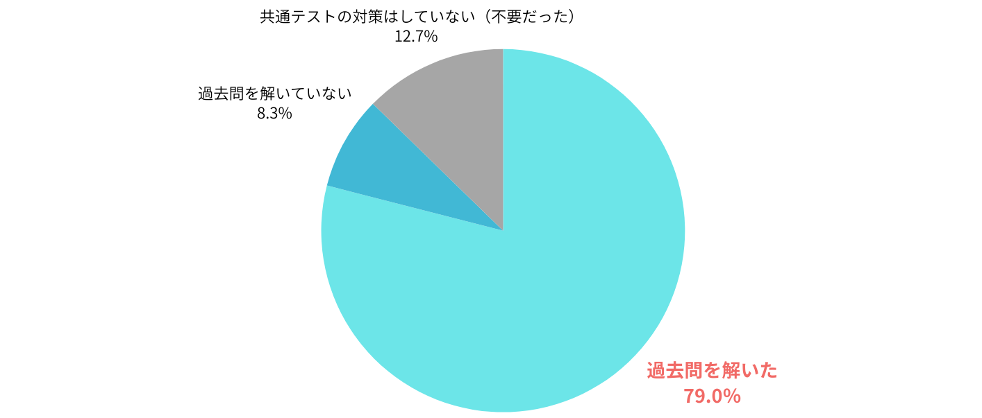共通テストの過去問対策は、79.0%が「過去問を解いた」と回答しています。これは「共通テストの対策はしていない(不要だった)」を除く回答者(すなわち、共通テスト対策が必要だった受験者:87.3%)の約9割にあたります。