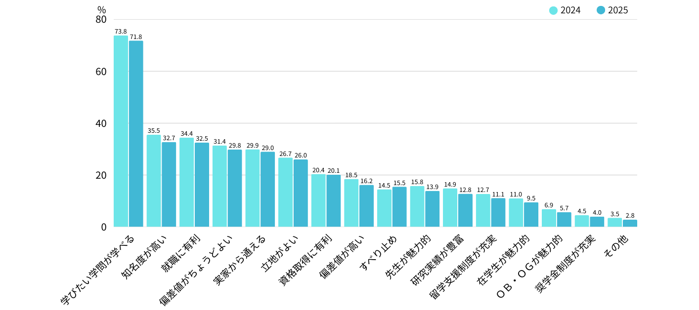 入学を決めた大学を受験した理由の第1位は「学びたい学問が学べる(71.8%)」で昨年調査と同じ結果がトップに。次いで「知名度が高い(32.7%)」、「就職に有利(32.5%)」となっており、こちらも昨年調査と同じ傾向となりました。