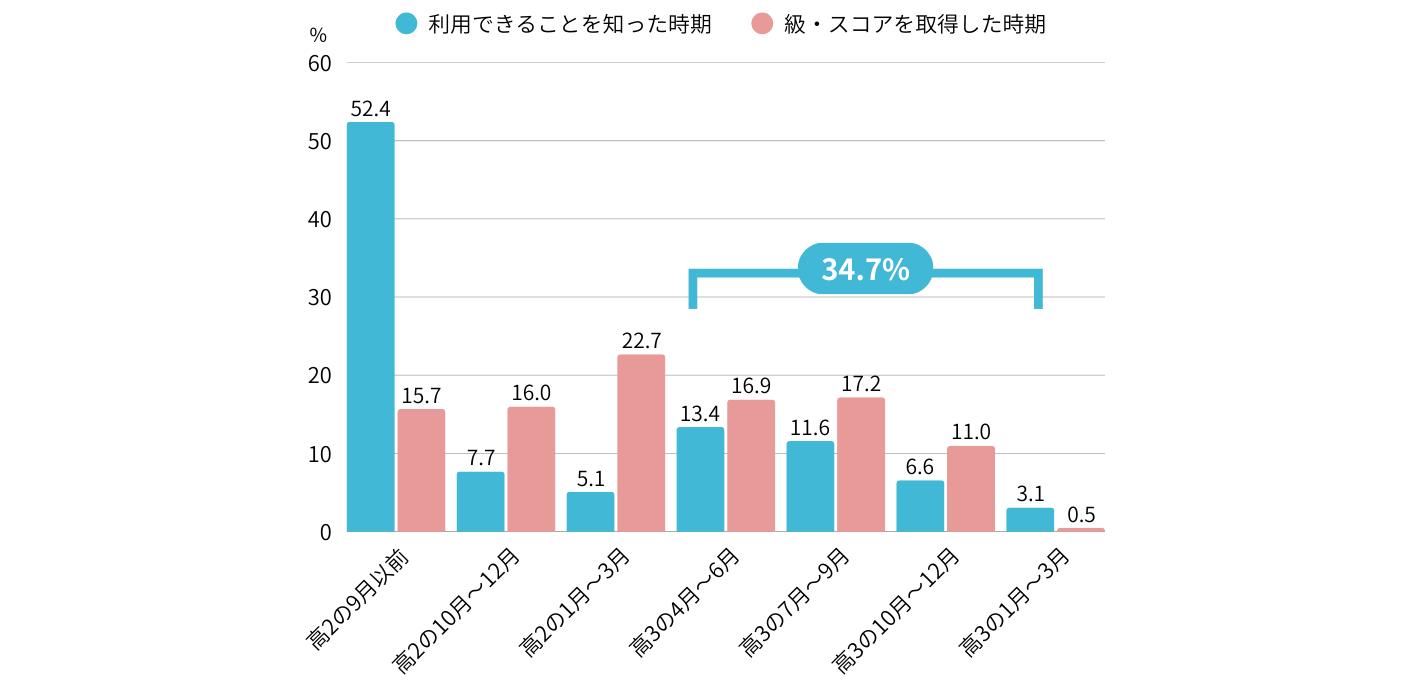 一方で、受験した大学の入試に外部検定が利用できると知った時期が「高3になってから」という受験生も34.7%存在するという結果となりました。