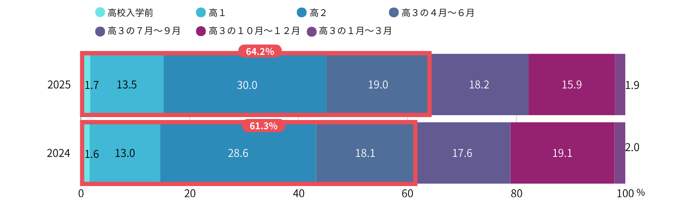 なお、一般選抜では約6割(58.7%)が高3の12月までに最初に過去問に取り組んでいることもわかる結果となりました。