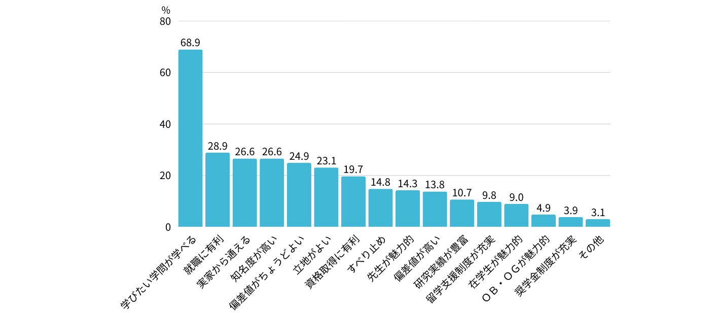 入学を決めた理由の第1位は「学びたい学問が学べる(68.9%)」となり、受験した理由の第1位と同じ結果に。次いで「就職に有利(28.9%)」、「実家から通える(26.6%)」、「知名度が高い(同)」という回答が多く、就職という目標や実家からの「距離の近さ」が、入学の決め手になっている受験生も多いようです。