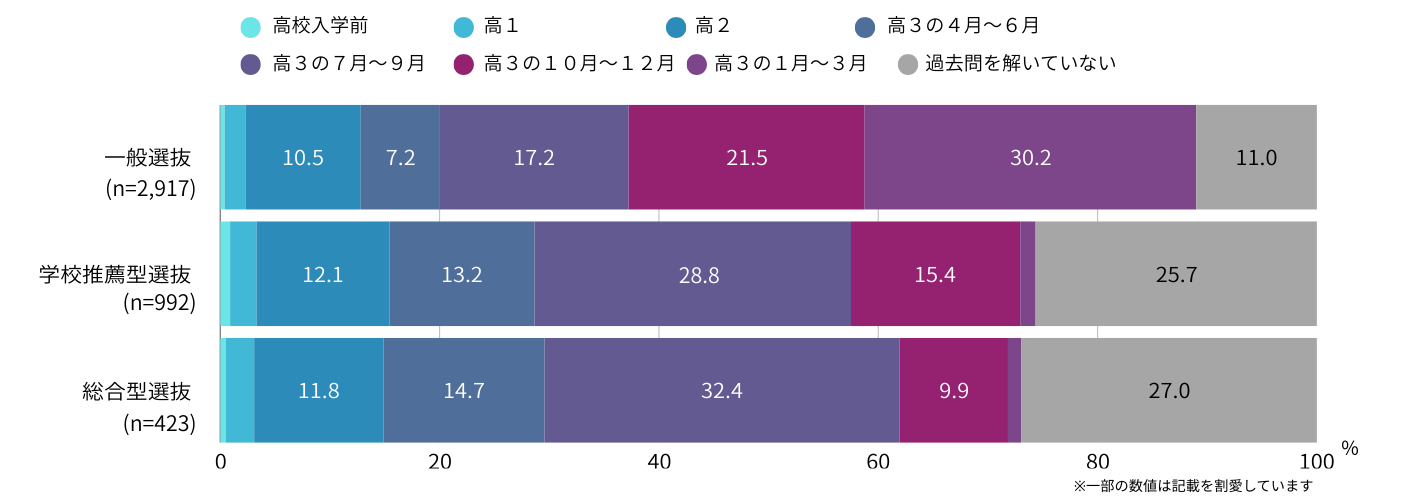 入学した大学の過去問対策時期は、受験した入試方式に影響を受ける。一般選抜は「高3の1月~3月」がもっとも多いのに対し、学校推薦型選抜・総合型選抜(年内入試)は「高3の7月~9月」がもっとも多い。