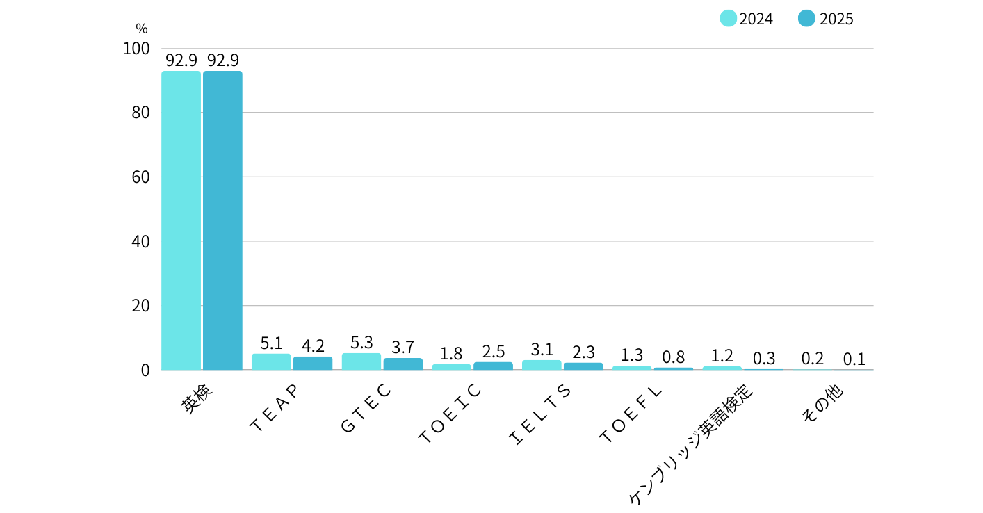入試に利用した外部検定は「英検」という回答が92.9%で昨年と同率の結果に。受験生が実際に利用する外部検定試験はほぼ「英検」一択という状況が続いています。