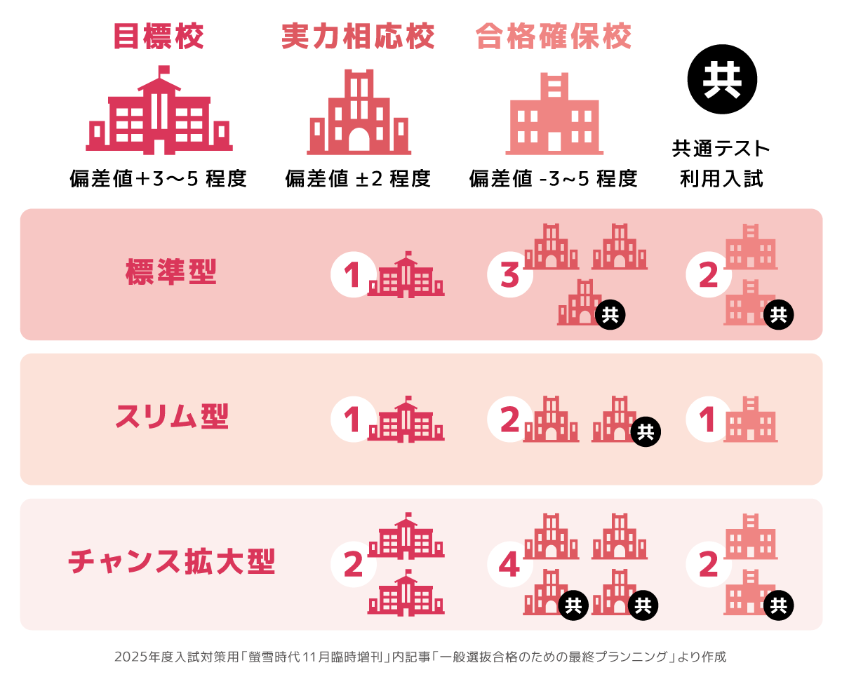 第1志望校に集中したい人や受験料を抑えたい人は、「スリム型」がおすすめ。「チャンス拡大型」については、受験校を増やすあまり試験日程が詰まりすぎて第1志望校の本番に支障が出ないよう、注意が必要です。