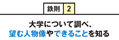 学校推薦型・総合型選抜は大学と受験生のマッチングのための入試です。志望校のアドミッション・ポリシーやホームページなどによく目を通し、大学が求める人物像や大学で可能な学びについて理解を深めましょう。