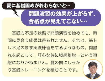 「夏に学力の基礎を固める」というのは、受験勉強の鉄則。夏休み中までに一定水準の基礎力を身につければ、2学期以降、効果的な問題演習に十分取り組めて、入試までに無理なく得点力を高めることができる。「基礎固め」こそ、夏休みの最重要目標と心得よう。