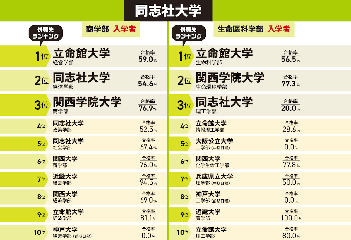 併願先は、関関同立など関西エリアの大学が占めており、学部系統は生命科学・理工・農学部など様々です。また、同志社大学の生命医科学部は、神戸大学の工学部(前期日程)、大阪公立大学の工学部・兵庫県立大学の理学部(中期日程)の併願先にもなっています。特に大阪公立大学の工学部(中期日程)は、募集人員が前期日程よりも多い学科が目立ちます。そのため、これらの国公立大学受験者もライバルになり、激戦となったようです。