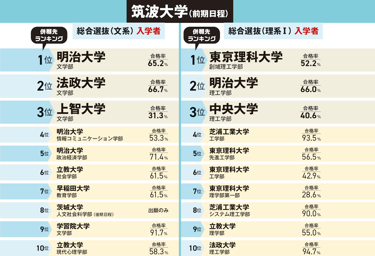 併願先は、東京理科大学の理工系4学部が目立ちますが、どの学部もB方式(独自入試)を受験した人が最も多く、筑波大学の2次試験の数学・理科・英語対策に取り組んできたため併願しやすかったようです。また、明治大学・中央大学の理工学部も併願者が多いのですが、合格率は前者が66.0%、後者は40.6%と難易が分かれました。特に中央大学は共通テスト利用選抜(単独方式:前期選考<個別試験を課さない>)で苦戦した模様。