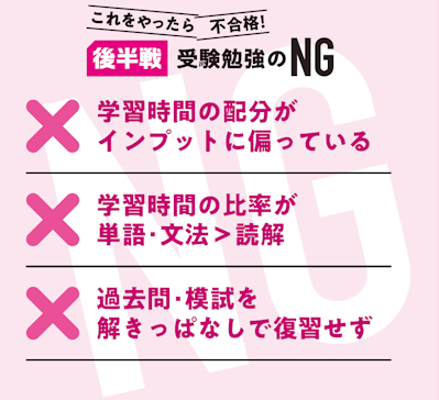 語彙や文法の基礎は夏休み終了までに確実に仕上げておきたいところだが、部活動や学校行事、他教科の学習などもあって、十分に仕上げられなかった人も多いだろう。2学期以降に実戦形式の学習と並行して、基礎力の不備をそのつど補っていくことは可能なので、気落ちせずに頑張ってほしい。受験英語のメインは長文読解である。適当に単語の意味をつなぎ合わせて意味をとるような読み方を卒業し、文構造を把握したうえで正確な読解ができることが必須である。スピードや語彙力は後から自然とついてくるので、現時点では「時間無制限・辞書利用可であれば合格ラインを超えられる」を1つの目安にしてほしい。