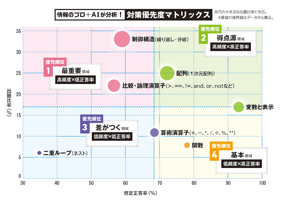 共通テストの第3問は「プログラミング」からの出題。分析データに基づく第3問攻略法は明快です。問題序盤で問われやすい「配列」の要素や添字、「変数と表示」に関する代入の設問は、問題文の読解で解答できる場合が多く、正答率は高めの「得点源領域」。まずは、ここで盤石な守りを固めるのが鉄則です。そのうえで、残った時間を使って攻めの対策に転じます。最大の攻め所は、ほぼ確実にプログラムに絡むにもかかわらず正答率が低い「制御構造」「比較・論理演算子」の「最重要領域」。さらに高得点を狙うなら、特有の計算パターンが問われる「算術演算子」や、最難関の「二重ループ」が潜む「差がつく領域」の攻略が必須です。守りを固めてから攻める、この戦略的思考が得点を左右します。