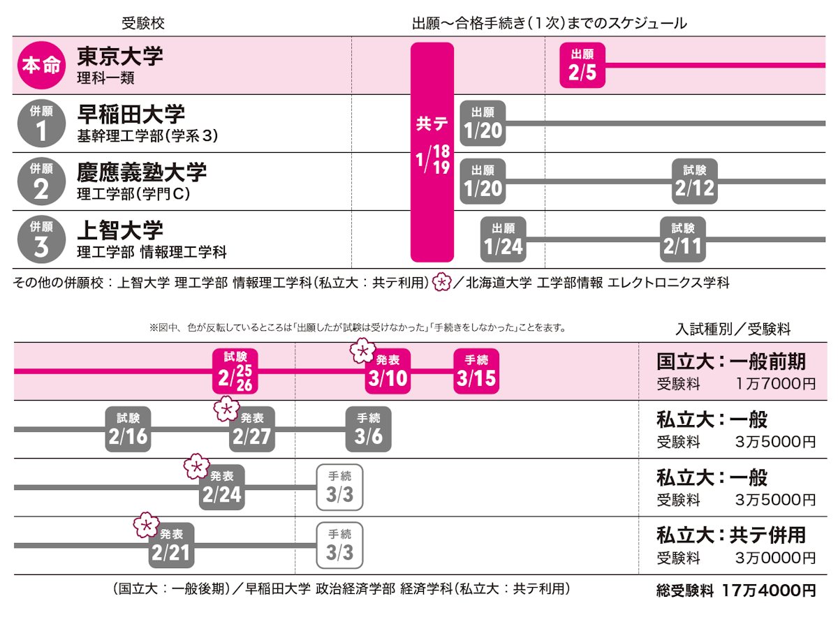 スケジュール一覧表を作成したことで、無駄に入学金を払うことを極力避けられました。ただし、この出願作業などで忙しい時期に学校を休むと、調査書などに関する大事な連絡を受け取り損ねることがあるので注意!プレッシャーに負けないように、計画的に頑張ってください。