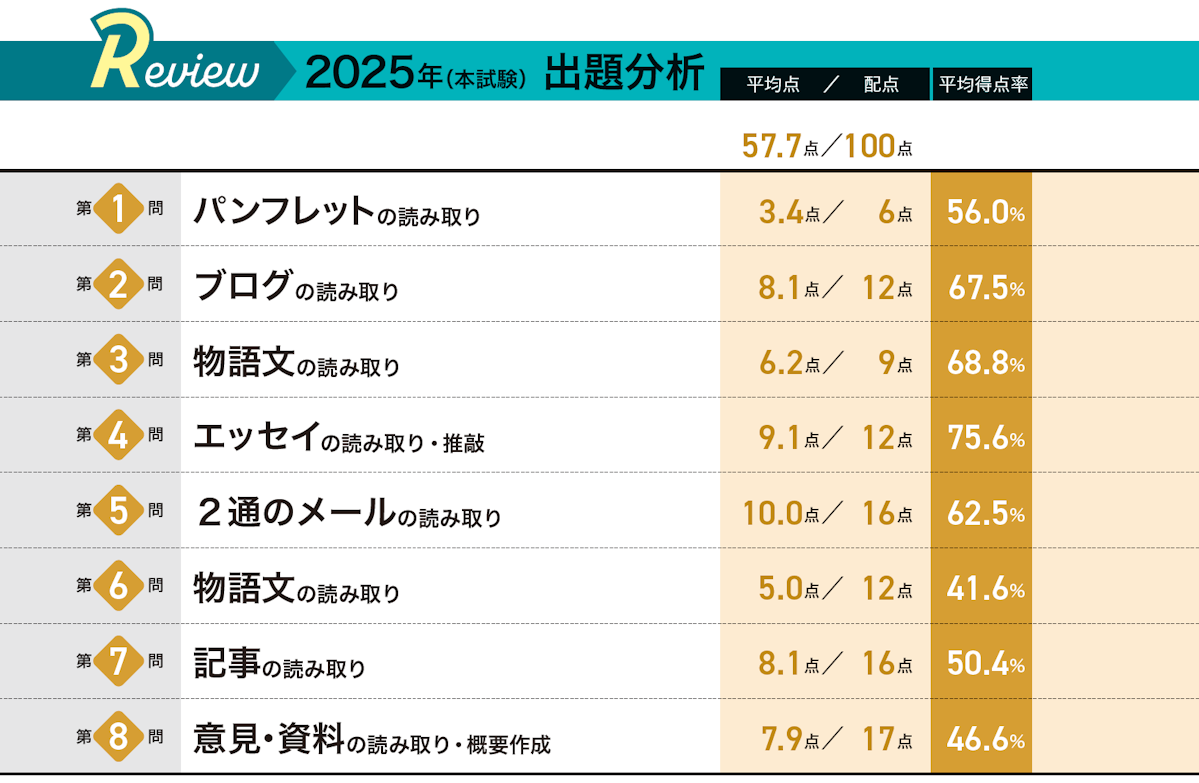 英語リーディングは、共通テスト開始以来、初めて出題形式が変化した。大問数が6題から8題に増えた一方、マーク数は5つ減って44となり、素材文の総語数は4900語から4200語に減少した。内容としては、パンフレットやブログなどの平易な文書から、記事・物語文・資料など従来のものに加え、第4問では教師のコメントを踏まえて推敲したり、第8問ではエッセイの概要を組み立てる設問が出題された。2026年も膨大な文章・資料を読んで設問に必要な情報を素早く探し出す「情報検索」的な側面の強いものになるだろう。平均点は2023年:53.8点、2024年:51.5点と年々下がり続けていたところ、2025年は57.7点に上昇した。2026年はその反動からやや難化する可能性がある。