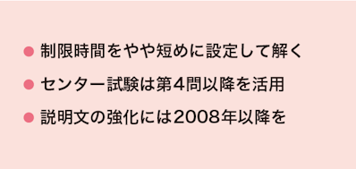 2025年の第8問は新傾向問題で、「宇宙開発の是非」について自分の立場を決めて、3段階のステップを踏みながらアウトラインを作成する問題であった。今後も、複数の文書を参照しながら条件に合った選択肢を複眼的に考察する力を問う問題が狙われるだろう。