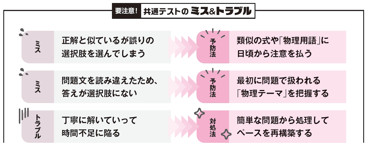 共通テストでは、「物理」「物理基礎」ともに身近な現象を扱う問題が、形式を工夫して出題される。したがって、問題の設定や形式に惑わされずに「どの物理法則が問われているか?」を素早く把握することが大切である。さらに、問題文で与えられたヒントや選択肢を活用して上手に解くことが、高得点獲得のカギとなる。また、なるべく早く普段通りの力が出せるように、取り組みやすい問題から始めて調子を上げていこう。