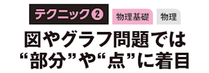 正しい図やグラフを選ぶ問題、与えられた図やグラフを基に考察する問題などが頻出している。図では設定のうち物理法則や物理的ポイントを表す“部分”に、グラフでは現象の特徴的な値を表す“点”に着目しよう。