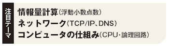 第1問は、いわゆる「小問集合」形式。しかし、2026年は、単なる用語知識だけでなく、一歩踏み込んだ「計算」や「仕組みの理解」が問われることで、難化すると予想します。特に「情報量計算」(浮動小数点数の表現方法など)や、2025年に手薄だった「ネットワーク」関連(TCP/IP、DNSの役割)は、出題の有力候補です。試験までに確認しておきましょう。「コンピュータの仕組み」(CPU・論理回路)にも要注意。「情報Ⅰ」特有の知識・考え方を要求されます。