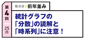 2026年は、各統計グラフの“得手・不得手”についての理解が問われそうです。特に「分散(データの散らばり)」の扱いに焦点が当たると予想。「箱ひげ図」は四分位範囲と外れ値から、「ヒストグラム」は分布の形状から分散の具合を視覚的に読み取れます。一方で「箱ひげ図」から平均値は直接読み取れません。各グラフが表現する「分散」や「代表値(平均値、中央値など)」の違いを意識して演習しておきましょう。次点で「時系列データ」(移動平均など)の読解も要警戒です。