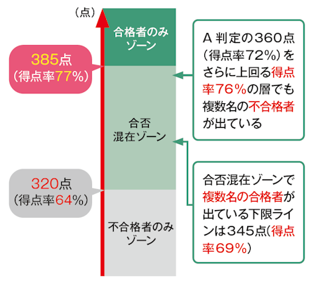 前年の共通テスト得点における合否状況(文学科:500点満点換算)