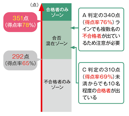 前年の共通テスト得点における合否状況(450点満点換算)