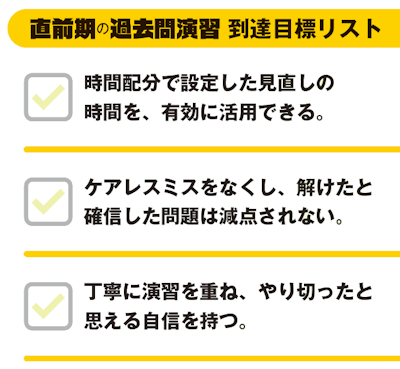 第1志望校合格を目指して、今後ラストスパートに入るわけですから、過去問演習は可能な限りさかのぼっていいでしょう。過去には20年分やった受験生もいました。ただし、無理に数をこなすより、5~10年分に丁寧に取り組み、繰り返すことをおすすめします。定着度と完成度が上がりますし、最近の出題傾向に合った対策が取れるでしょう。そのうえで余裕があれば、併願校について各2~3年分解いてみましょう。さらに余裕がある人は、他大学の類似問題に取り組むことも応用の幅を広げ、実力を強化するには有効です。