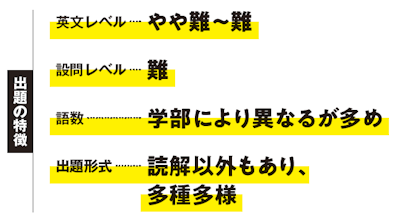 読解問題の文章の長さはそれほどでもないが、大問数が多いことが共通点として挙げられる。さらに、選択肢の情報量も概して多いため、設問処理に時間を要し、時間内に解き終えるのに苦労するだろう。一部の学部で文法・語法問題(正誤問題)や自由英作文が出題され、これもまた難易度が高い。
