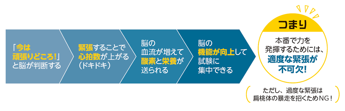 入試の本番で実力をフルに発揮するためには、適度な緊張が不可欠です。脳が良い緊張状態にあるときは、心拍数が上がり脳の血流が良くなることで脳に酸素と栄養が送られ、集中力、判断力、情報処理力といった機能が向上。問題を解くうえでもプラスに働きます。一方、過度に緊張すると脳内で扁桃体が暴走してパニック状態になり、思考や判断を司る前頭前野に悪影響を与え、機能を低下させてしまいます。そうなると、頭が真っ白になる、文字を読んでも頭に入らない…といった状態に陥ってしまうのです。