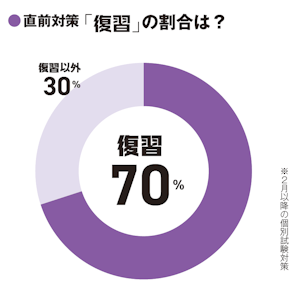 復習を柱としつつ、実戦感覚を養うための演習にも取り組もう。漫然と数をこなすのではなく、志望校の過去問や類題を使い、時間配分や解答手順の確認など、目的意識を持って行いたい。効果的なのが「試験時間を10分短くする」「騒がしくて集中しにくい場所で解く」など、本番より過酷な条件下で演習すること。出題形式が類似している上位大学の問題を解くのもよい。短期間での実力伸長のためには、ある程度負荷をかけて鍛える必要がある。