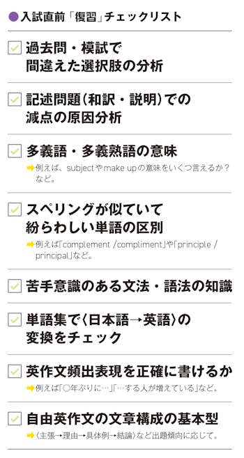 国公立大・私立大の入試直前期は、新しい問題集や参考書に手を出してはいけない。これまでに学習してきた内容を整理し、得点につながる形で完成させることが最重要だ。特に難関大では、語彙の知識、文法・語法の理解が曖昧な状態では、高得点は望めない。直前期は、これまでに解いてきた過去問や模試で間違えた問題、部分点にとどまった記述答案を徹底的に見直してほしい。それにより失点の原因を可視化し、新たに見つかった弱点を1つずつ克服することで得点力を着実に伸ばし、合格点を勝ち取ってほしい。