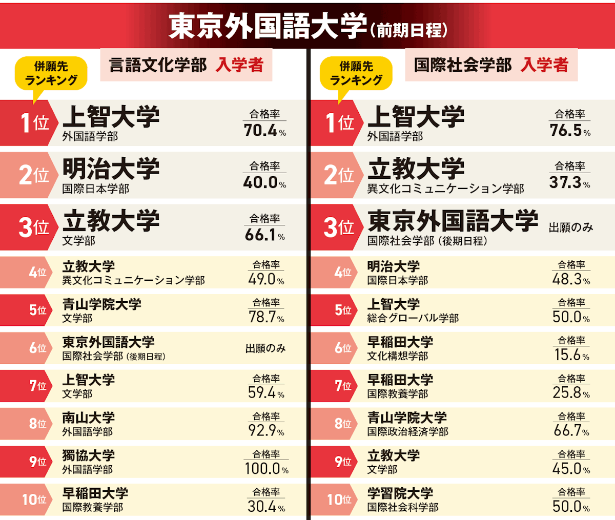 併願先は首都圏の大学が占めており、上智大学は外国語・総合グローバル学部、立教大学は異文化コミュニケーション・文学部、早稲田大学は文化構想・国際教養学部がランクイン。特に上智大学の外国語学部は、言語文化学部の入学者と同様に、共通テスト利用入試の受験者が大多数で、合格率も高めです。東京外国語大学は3学部のうち国際社会学部のみ後期日程を実施しているため、後期日程での併願が多く見られました。