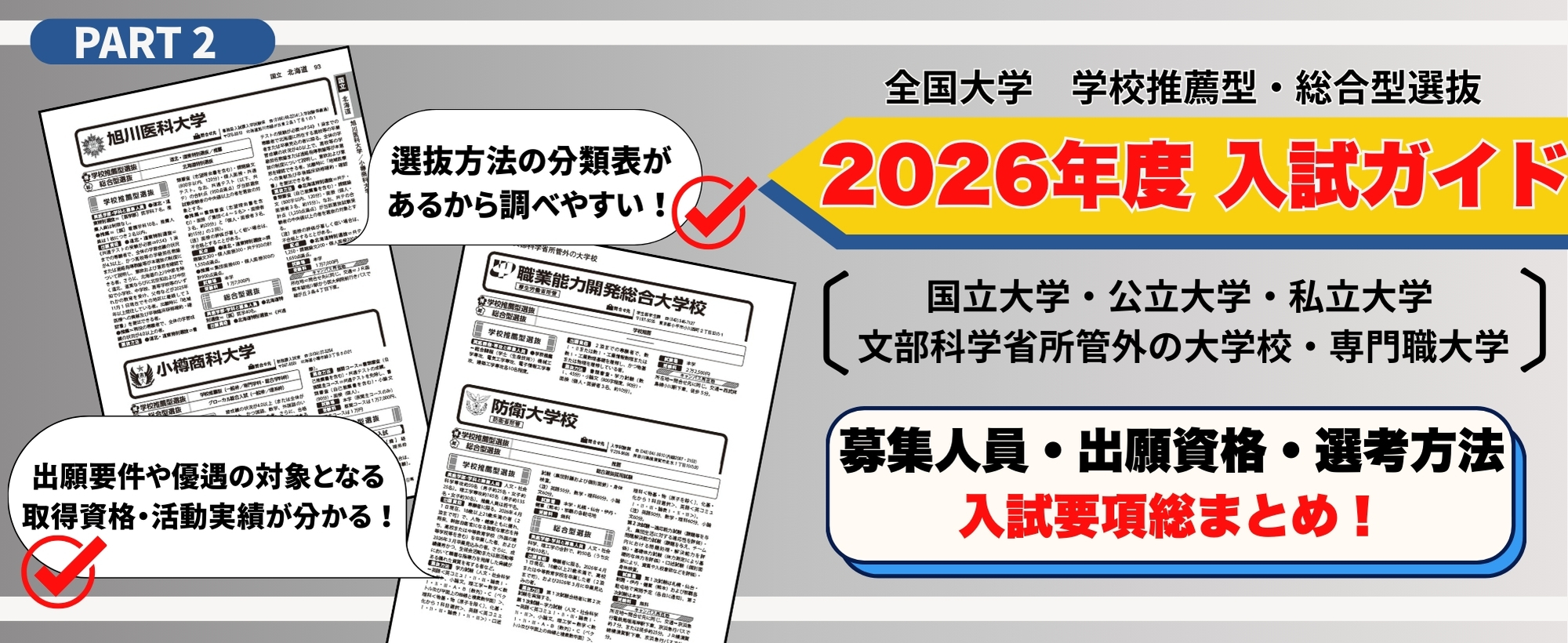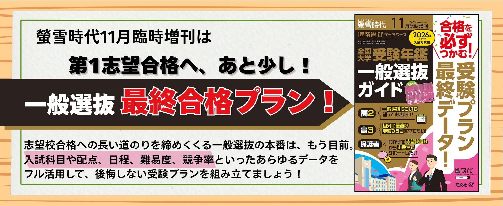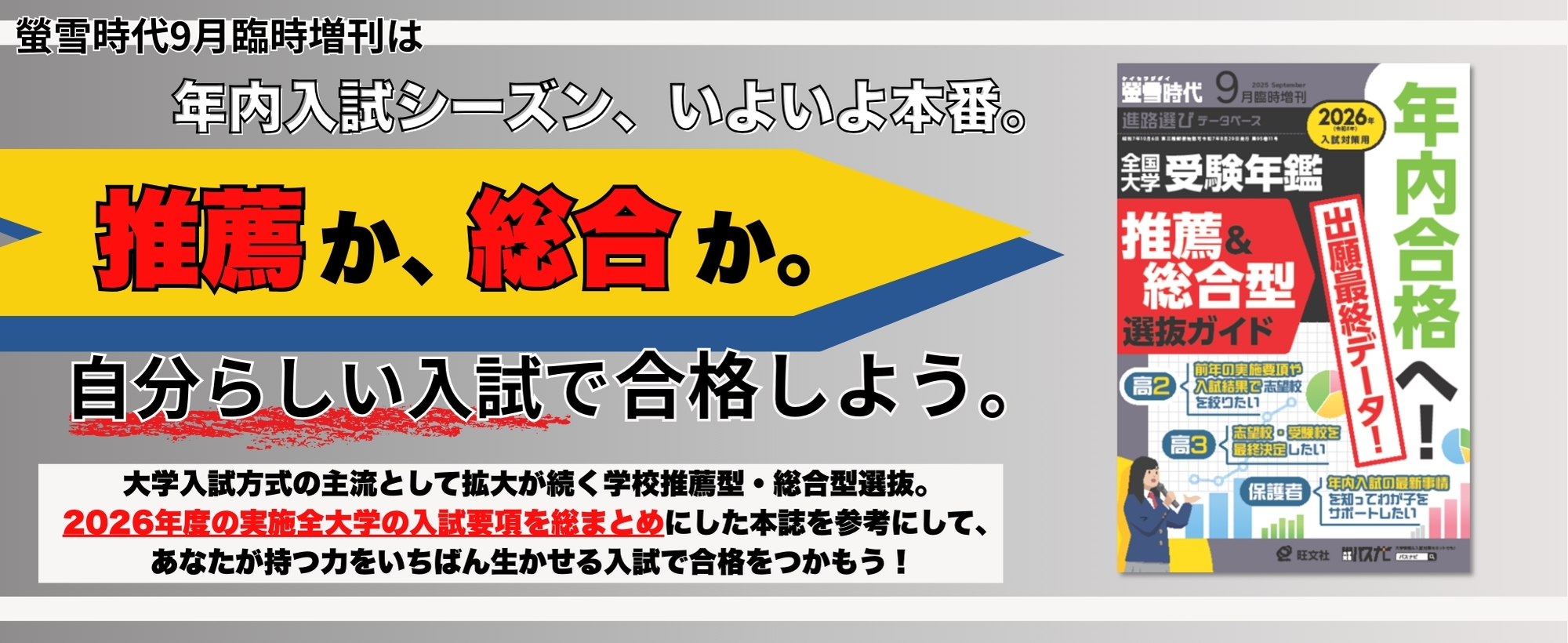 本誌『螢雪時代11月臨時増刊 全国大学受験年鑑[一般選抜ガイド]』は、学部・学科・選抜方式別の募集人員、入試日程、科目・配点など、2026年に一般選抜を実施するすべての大学の入試/選抜要項情報をまとめました。