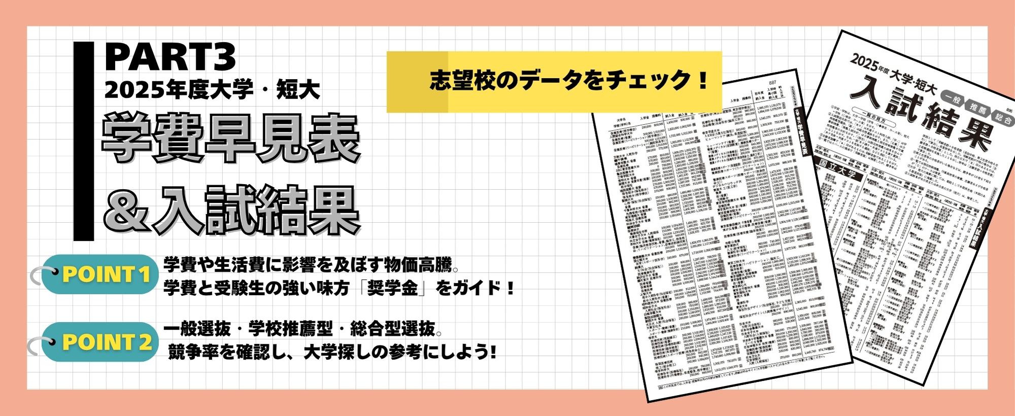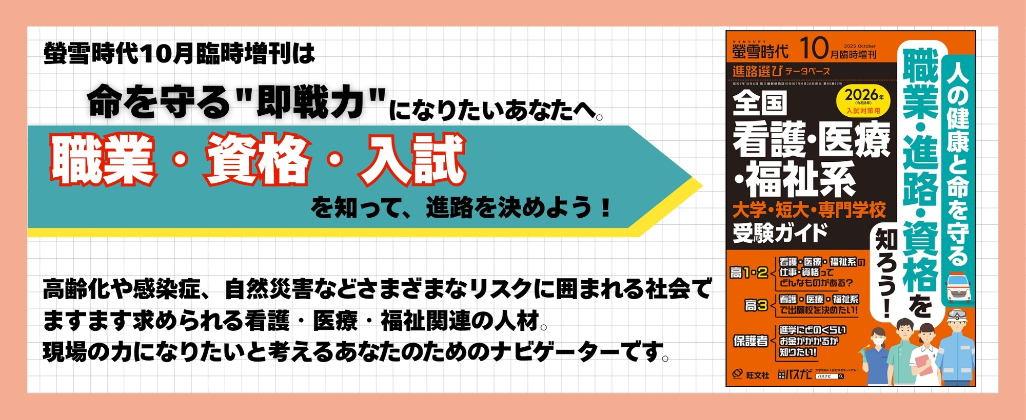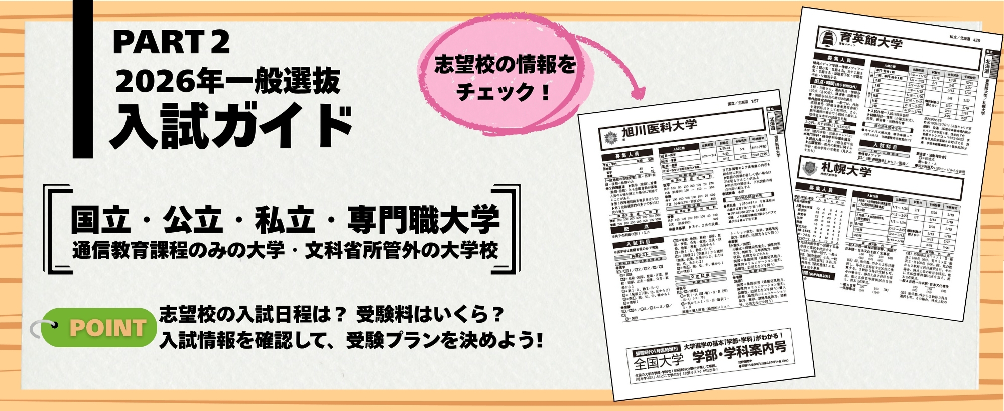 本誌『螢雪時代11月臨時増刊 全国大学受験年鑑[一般選抜ガイド]』は、学部・学科・選抜方式別の募集人員、入試日程、科目・配点など、2026年に一般選抜を実施するすべての大学の入試/選抜要項情報をまとめました。