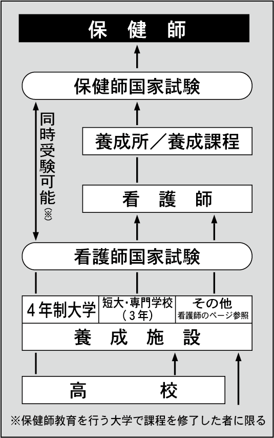 下のチャート図でわかるように、保健師は全員、看護師の資格をもつことになっている。大きく分けると、病気になった人を対象にするのが看護師、そうでない人々の健康を守るのが保健師と考えればよい。